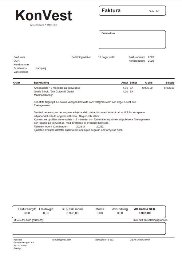 KonVest skickar e-fakturor angående e-bok och annonsplats, trots att ingen beställning har skett. Längre ner på fakturan står det att det är ett erbjudande.